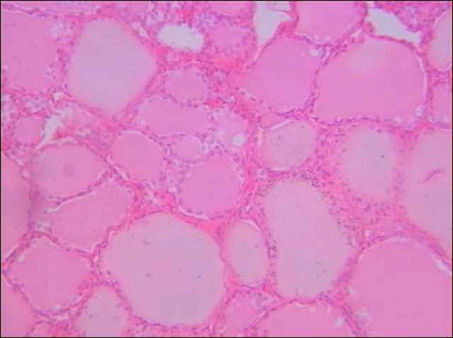甲狀腺於低倍觀察下呈泡狀構造,其細部說明見進一步放大。