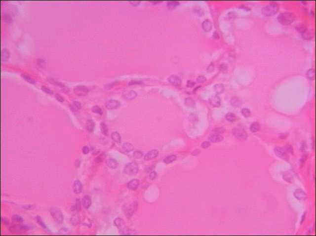 由單層立方上皮圍成之甲狀腺濾泡(thyroid follicle),其內所含呈嗜酸性染色物質稱為甲狀腺膠體(colloid),為甲狀腺儲存甲狀腺球蛋白(thyroglobulmin)的位置。