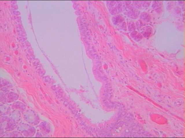 本切片之位置為唾腺之輸出導管部分(100x),位於小葉間結締組織。由唾腺腺泡所分泌之唾液,經小葉內導管(單層立方至單層柱狀上皮)再吸收及分泌後,送到輸出導管以輸送至口腔(複層鱗狀上皮)。故於此區段之導管上皮中,可觀察到由單層柱狀上皮過渡至複層鱗狀上皮時,所形成之複層柱狀上皮構造。