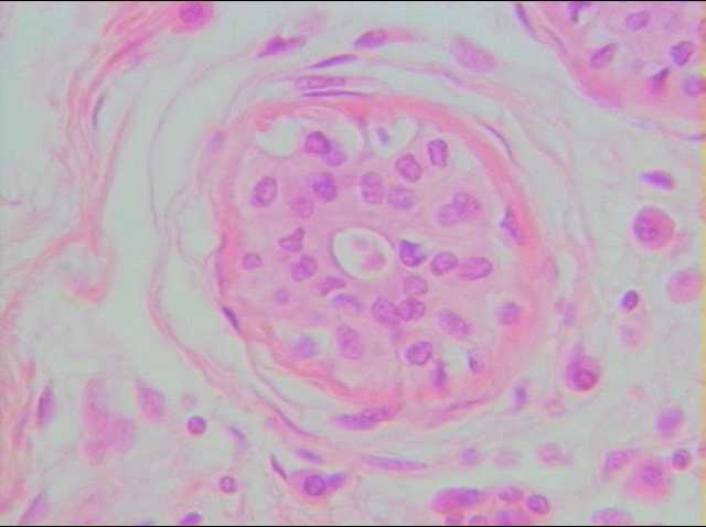 高倍下(400x)之汗腺導管,可見其管壁由兩層之立方形之上皮細胞所構成,故為複層立方上皮。