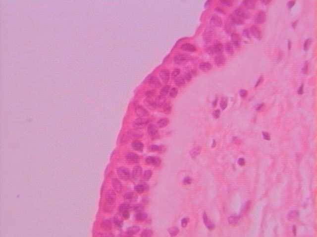 高倍下(400x)之雄性海綿體部尿道,可見其尿道之管壁由兩層以上之立方形上皮細胞所構成之複層立方上皮。