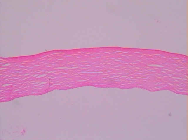 角膜呈透明狀,由外側無角質化之複層鱗狀上皮、緻密規則結締組織及內側單層鱗狀內皮所構成,其間不含任何之血管及色素。