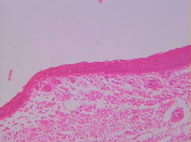 在進一步放大(100x)後,可見覆蓋聲帶區域之上皮為複層鱗狀上皮與其下方之疏鬆結締組織。