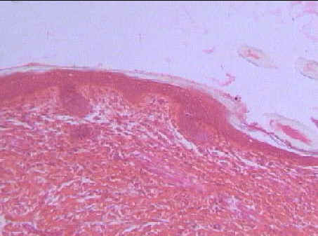 低倍下(100x)之薄皮膚切片,其表皮層由角質化複層鱗狀上皮所組成,而真皮層則分為乳凸層與網狀層。乳凸層部份為疏鬆結締組織,而網狀層則為緻密不規則結締組織所構成。