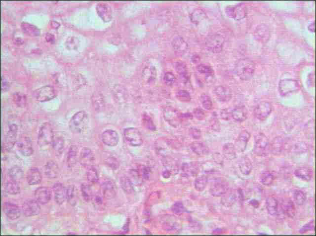 高倍下之陰道複層鱗狀上皮底層,細胞呈立方至矮柱狀,細胞核呈圓形。由基底層向表層接近,則細胞形態越趨於扁平。