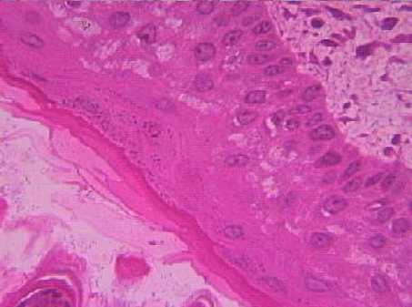 高倍下(400x)口腔上顎上皮為複層鱗狀上皮,其最外之數層細胞扁平無核,因角質化而在常規染色(h&e stain)下呈強嗜伊紅性之紅色。
