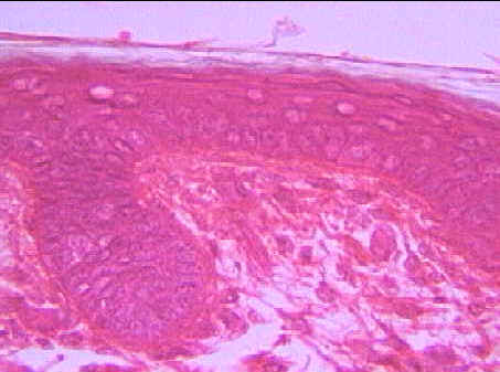 高倍下(400x)之薄皮膚,可見表皮由角質化複層鱗狀上皮所構成,其皮膚之基底層細胞以明顯之基底膜與下方結締組織結合。