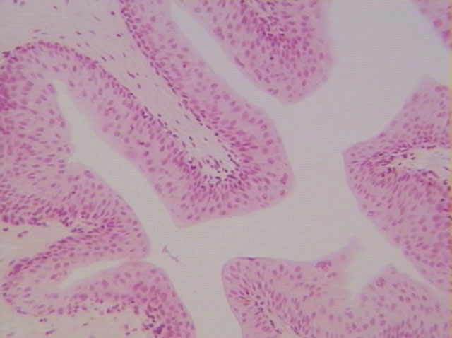 進一步放大(100x)之輸尿管移形上皮與結締組織,其移形上皮之底層細胞具有較高之細胞密度,而表層細胞則細胞密度較低。