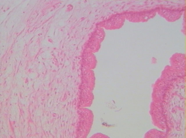 在進一步放大(100x)後之尿膜構造,其上皮組織為移形上皮,而管壁結締組織與周圍之黏液結締組織類似,但較為緻密。