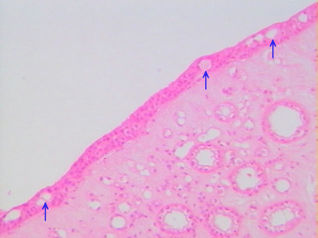 進一步放大(100x)之腎盂乳凸部,可見其表面覆蓋之移形上皮及下方之腎乳凸髓質,由結締組織、血管及集尿管等所構成,另外可於移形上皮中觀察到部分集尿管之開口處(箭頭處)。