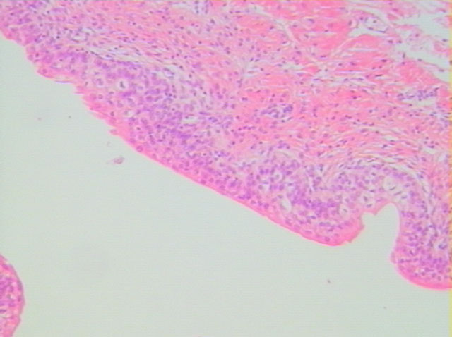 進一步放大(100x)之膀胱,其內層由移形上皮所覆蓋,上皮下方為結締組織。移形上皮之細胞形態可隨所受張力之改變而改變,當張力增加時移形上皮細胞可被拉平以增加覆蓋面積,提供膀胱因應所儲存尿液容積變更而時大時小之能力。結締組織在內層緊鄰上皮部分為緻密不規則之結締組織,而較外層靠近平滑肌肌肉層部份則為疏鬆結締組織。 |