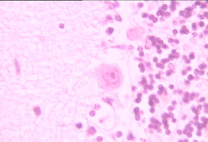 高倍率 (400x) 下常規染色之小腦柏金氏細胞層 (purkinje cell layer),厚度僅有一層細胞,柏金氏細胞為大型錐狀細胞,位於小腦皮質之分子層 (molecular layer) 與顆粒層 (granular layer) 之間。
