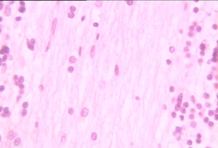 高倍率 (400x) 常規染色之小腦髓質 (medulla),呈淡染色夾於顆粒層 (granular layer) 之間,分布其間之細胞核為神經膠細胞 (neuroglia) 所有。