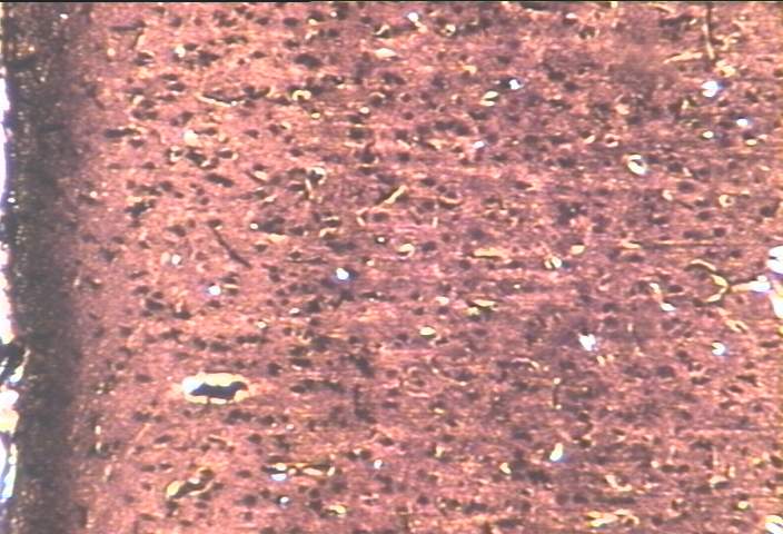 中倍率 (100x) 下特殊染色 (銀染色) 之大腦皮質 (cerebral cortex) 淺層區域,可見染色成棕色神經細胞之皮質區域及外側染成深黑色構造之軟腦膜 (pia mater)。